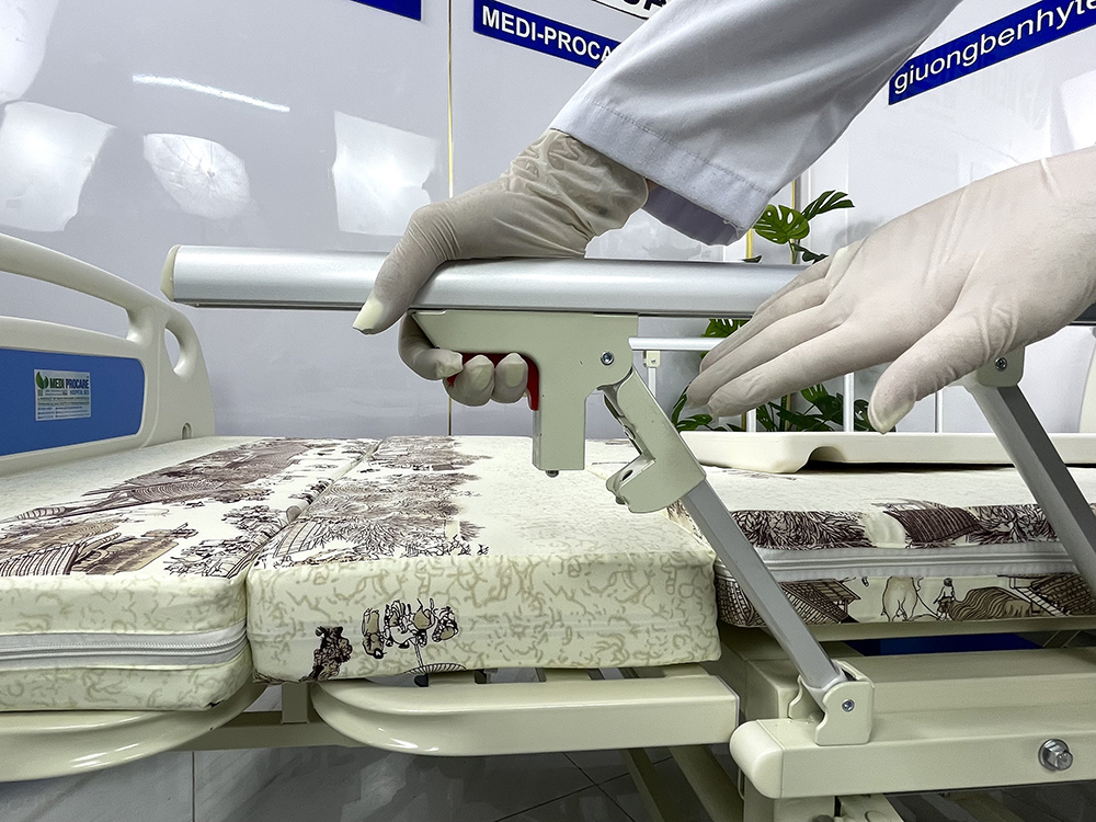 Với hệ thống tay quay cơ có trợ lực, người thân hoặc y tá dễ dàng điều chỉnh tư thế bệnh nhân mà không tốn nhiều sức.