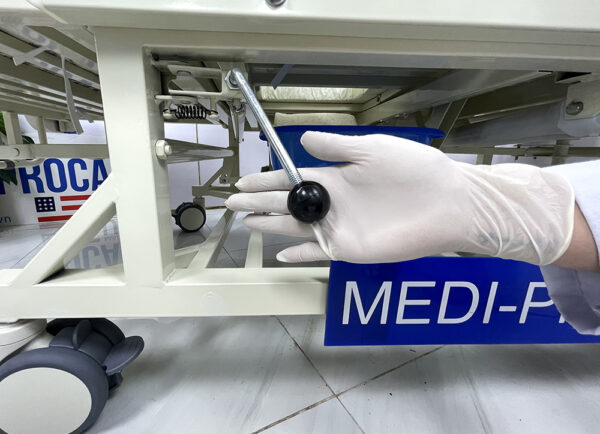 Giường y tế MEDI-PROCARE MP-BED-M5 vận hành bằng hệ thống cơ học với 4 tay quay và 1 tay gạt bô vệ sinh, được chế tạo từ thép cao cấp chống gỉ sét, bền bỉ theo thời gian.