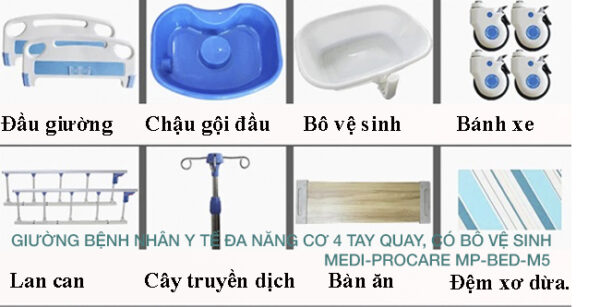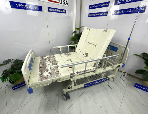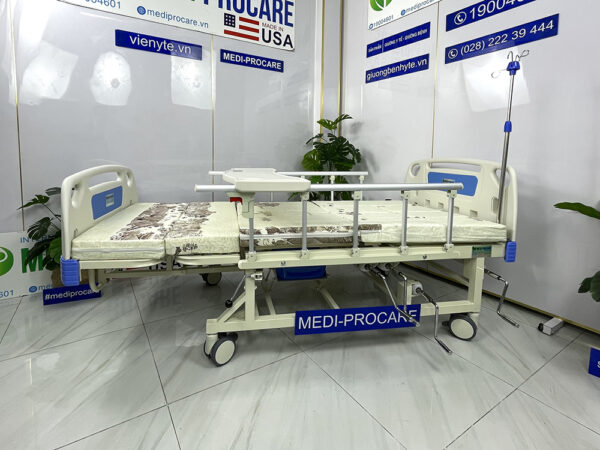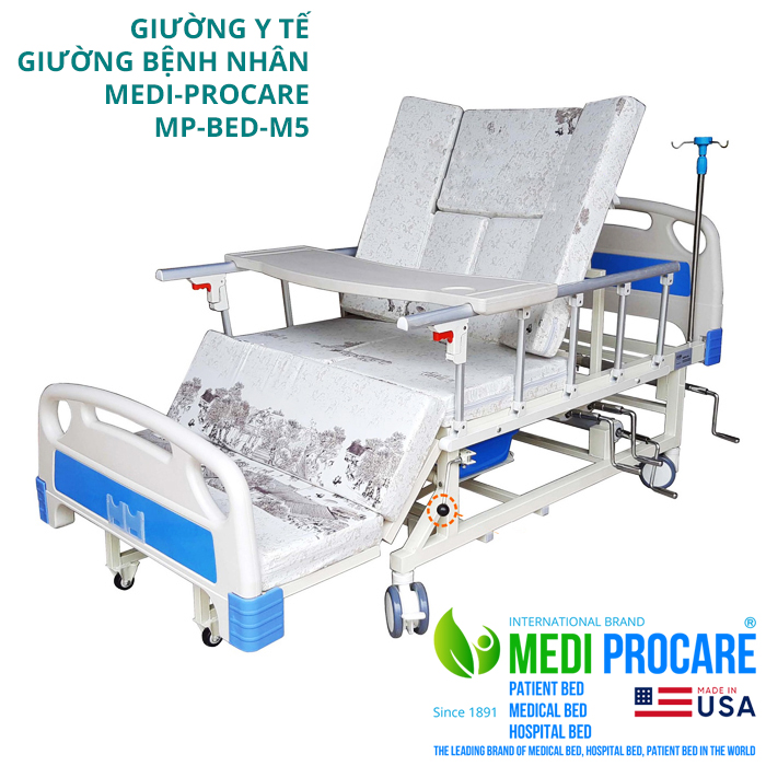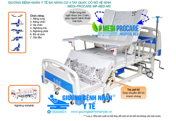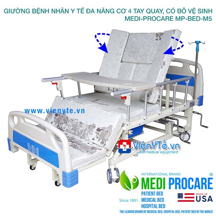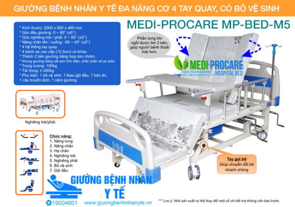Giường y tế, giường bệnh nhân cơ, đa năng, 4 tay quay, có bô vệ sinh MEDI-PROCARE MP-BED-M5 là giải pháp chăm sóc toàn diện, hiện đại và an toàn cho người già, người bệnh tại nhà và bệnh viện.